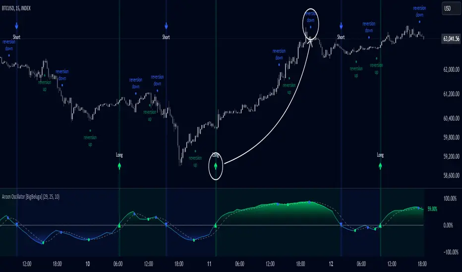 Aroon Oscillator with Mean Reversion & Trend Signals is a versatile tool that helps traders identify both trend direction and potential mean reversion points. The core Aroon Oscillator tracks the strength of a trend by measuring how long it has been since a high or low price occurred within a specified period. This oscillator provides trend-following signals (LONG/SHORT) along with mean reversion signals, giving traders both the ability to ride trends and anticipate reversals.