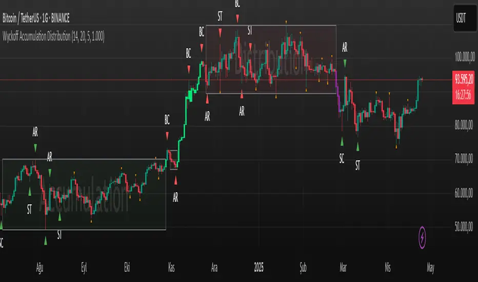 This Pine Script is a technical analysis indicator built around the Wyckoff Method, designed to detect accumulation and distribution phases using RSI (Relative Strength Index) and pivot points. It automatically marks key structural turning points on the chart and highlights relevant zones with colored boxes.