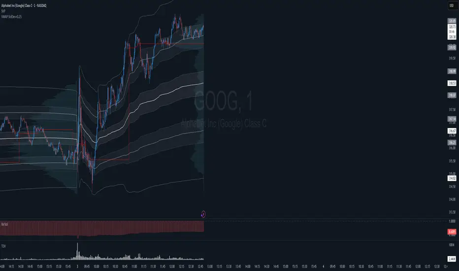 Around VWAP and the first deviation level, extra ±0.25 offset bands are added to highlight tighter ranges. These shaded zones help traders identify areas of expected price concentration, potential support and resistance, and volatility boundaries.