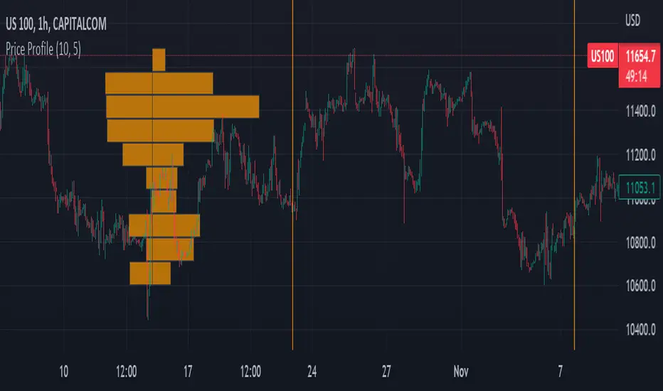 The indicator shows number of candles present in the horizontal box areas for the given time window. You can set up: