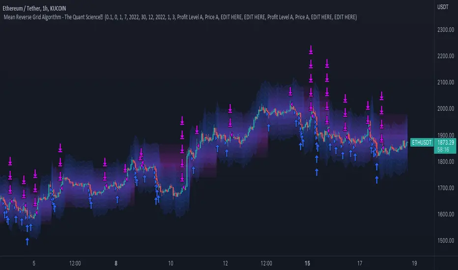 1. Long algorithm: opens long positions with 20% of the capital every time the price crossunder a lower grid, for a maximum total of 5 simultaneous trades. Trades are closed each time the price crossover a higher grid.