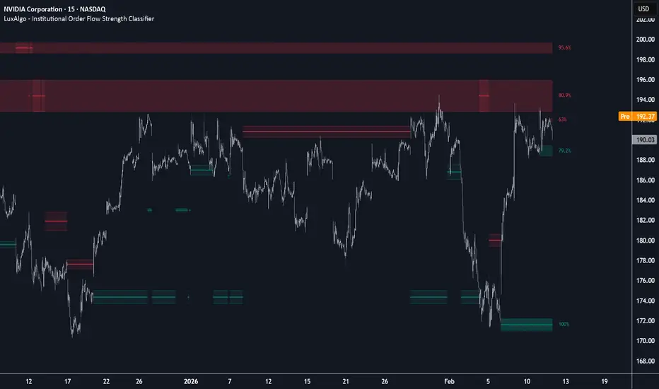 The Institutional Order Flow Strength Classifier tool identifies and ranks unmitigated order blocks by analyzing the institutional intensity behind market structure breaks.