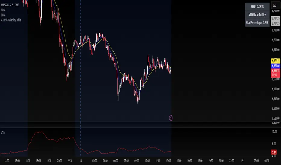 This visual tool displays real-time ATRP, volatility classification, and corresponding risk percentage in a compact on-chart table. Ideal for systematic traders who rely on volatility-based decision-making, position sizing, or risk management models.