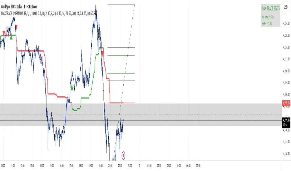 MAX TRADE is a smart trend-following indicator designed for Forex and XAUUSD. It uses a dynamic channel with Fibonacci levels to generate clear LONG and SHORT signals on any timeframe. The script supports fixed pip SL/TP, partial take profits, break-even logic and optional EMA/RSI/ATR filters to avoid bad entries. It also tracks win rate and total percent profit in real time so you can quickly see how the strategy is performing on your backtests.