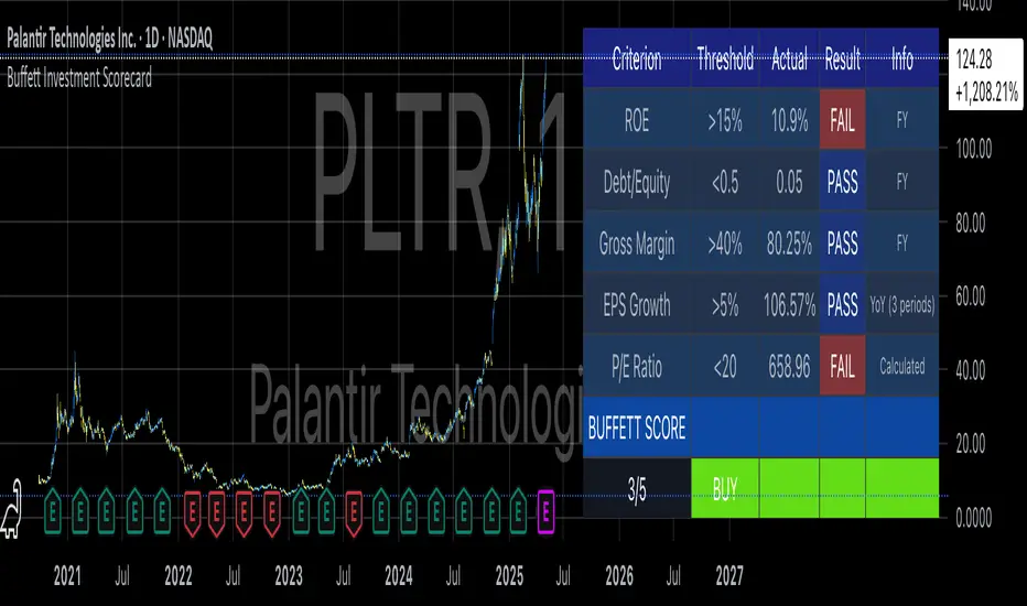 The TradingView indicator calculates a cumulative score based on these five metrics, providing a simplified assessment of whether a stock meets Buffett's criteria. Results are displayed in a color-coded table showing each criterion's status (PASS/FAIL).