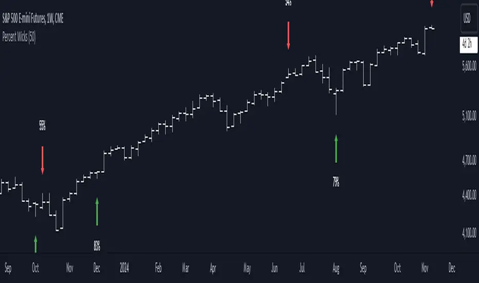 Calculates the percentage of the upper and lower wick on each candle. Wicks with a percent that are higher than a set percentage (Default is 60%) are assigned a color (upper = red 🔴) and (lower = green 🟢)
