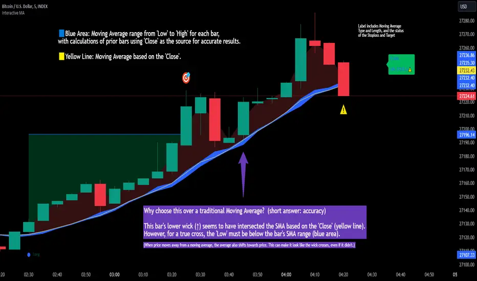 - To accurately determine that a wick has crossed a moving average, you must examine the moving average's range on that bar (blue area on this indicator) and ensure the wick fully traverses this area.