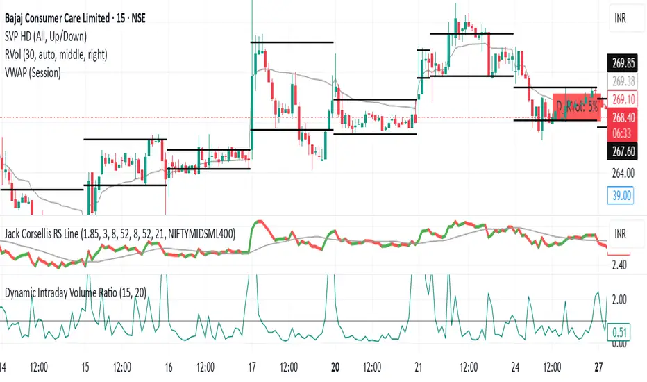 Compares intraday candle volume to average intraday candle volume over a predefined period