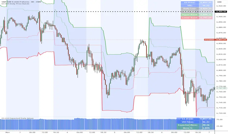 This indicator plots dynamic intraday price bands for ES futures based on real-time volatility levels measured by the VIX (CBOE Volatility Index). The bands evolve throughout the trading day, providing volatility-adjusted price targets.