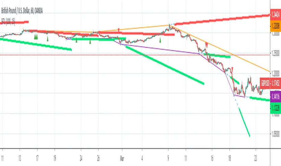 This indicator will plot two trend lines at any given time. A resistance trend line and a support trend line. The resistance trend is shown with red circles and is created by joining swing highs together. The second is a support trend which is created by joining swing lows.