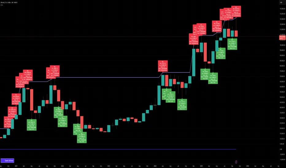 The DCA Percent Signal Indicator generates buy and sell signals based on percentage drops from all-time highs and percentage gains from lowest lows since ATH. This indicator is designed for pyramiding strategies where each signal represents a configurable percentage of equity allocation.