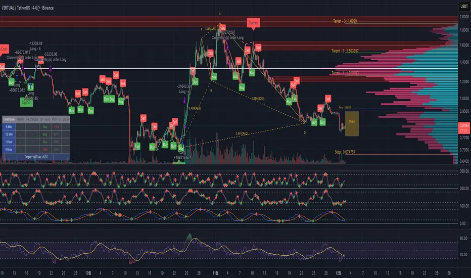 Overview This indicator is an all-in-one dashboard designed to monitor 4 key timeframes (5m, 15m, 1H, 4H) simultaneously on a single chart. It seeks Confluence by combining the Counter-trend strategy of Harmonic Patterns with the Trend-following strategy of the UT Bot, backed by RSI momentum analysis.