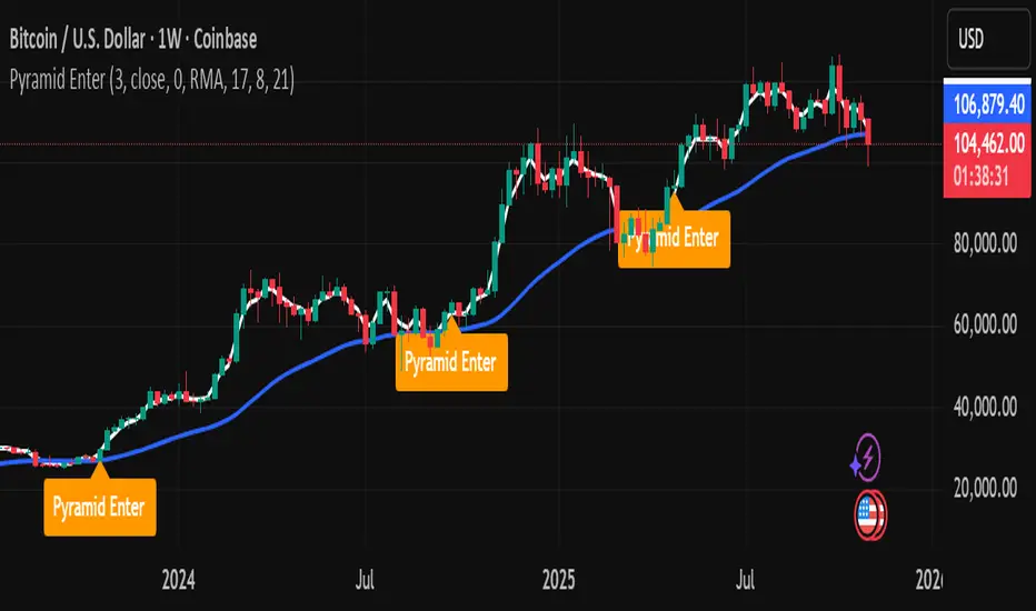 Pyramid Enter is a lightweight, educational visualization of additive entries (“pyramiding into strength”). It’s designed to help you study how layered entries might line up during persistent trends. This script does not execute orders, make predictions, or provide financial advice. It simply shows where entry candidates could appear under a simple crossover framework with an optional trend filter.