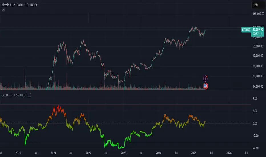 It leverages two well-known valuation models — CVDD (Cumulative Value Days Destroyed) and Terminal Price — to define a dynamic valuation range that adapts over time. These reference points are combined with a custom Z-score framework to evaluate how extended price is compared to long-term value zones.