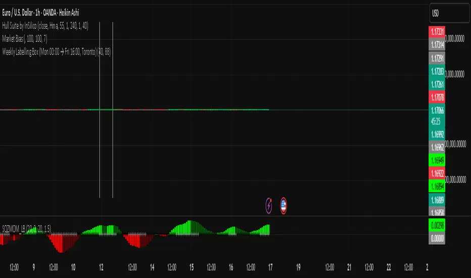 This tool is strictly a visual framing indicator. It does not compute labels, statistics, alerts, or extended S/R projections. Its single responsibility is to clearly present the week’s realized range in the Toronto session window so you can layer your own execution or analytics on top.