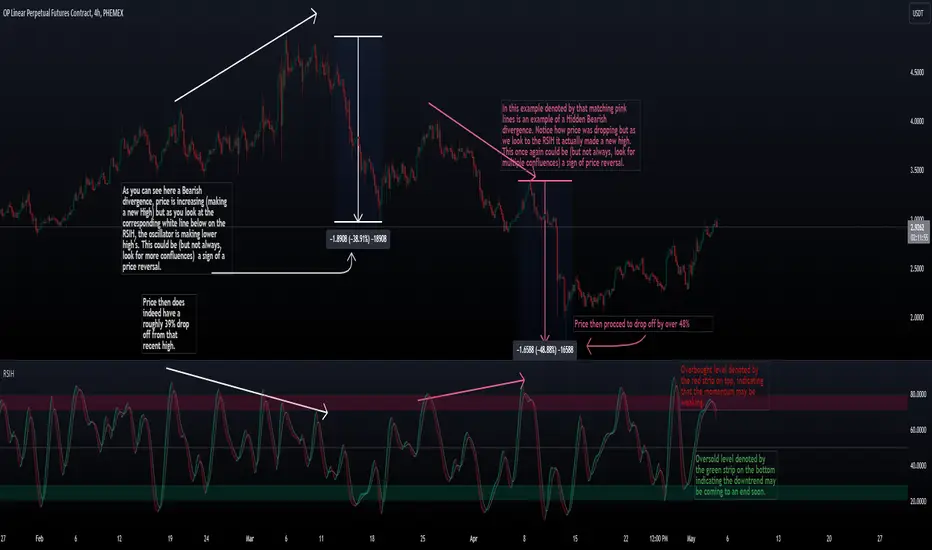 This indicator works well with both bullish and bearish divergences. It also works well with oversold and overbought indications. Shown by the Red zone on top (Overbought) and the green zone on the bottom(oversold). Each which have an adjustable buffer zone. You may need to adjust the length of the RSIH to suit your asset. There are also multiply signal line's to choose from. Also take note of when the RSIH crosses up or down on the signal line.