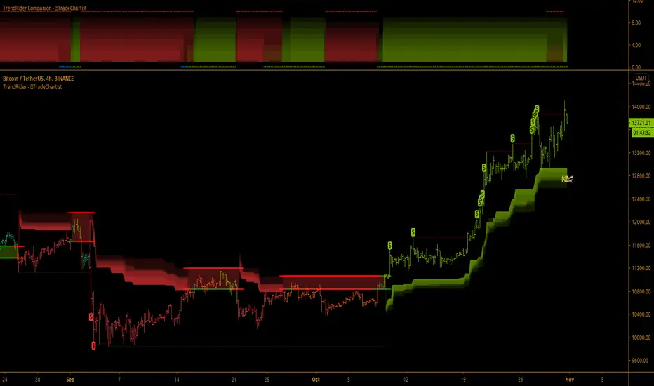 This script doesn't have Stop Loss and Take Profit plots, but it can be connected to ™TradeChartist Plug and Trade as Oscillatory signal ("TrendRider Signal") to generate Automatic Targets, set StopLoss and Take Profit plots and to create all types of alerts too. The 4hr chart of ICX-BTC below shows TrendRider connected to ™TradeChartist Plug and Trade.