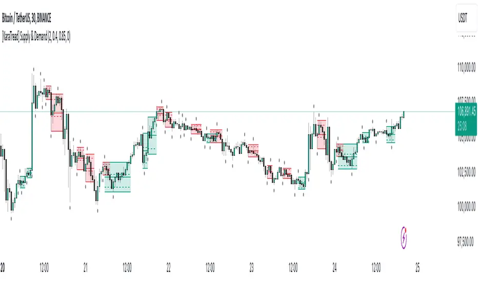 The "[KaraTread] Supply & Demand Indicator" is designed to analyze market supply and demand zones, identify key levels such as swing points (local highs and lows), and plot Fibonacci levels. Its primary goal is to detect potential entry points, set stop-losses, and determine take-profit targets based on market structure analysis.