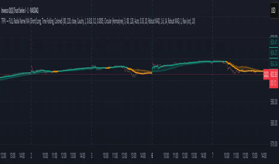 TFPV is a pair of adaptive moving averages built with a radial kernel (Gaussian/Laplacian/Cauchy) on a joint metric of time, price, and volume. It can “fold” time along the market’s dominant cycle so that bars separated by entire cycles still contribute as if they were near each other—helpful for cyclical or range-bound markets. The short/long lines auto-color by regime and include cross alerts.