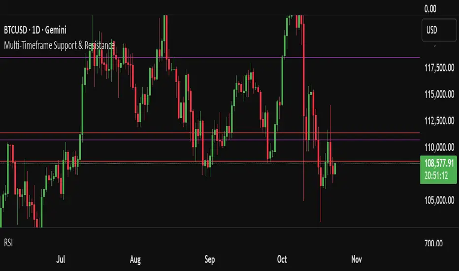This indicator automatically plots dynamic support and resistance levels across multiple timeframes — including 1H, 4H, 1D, 1W, 1M, and the current chart timeframe. Each level is color-coded for clarity and extends across the chart to highlight key price zones.