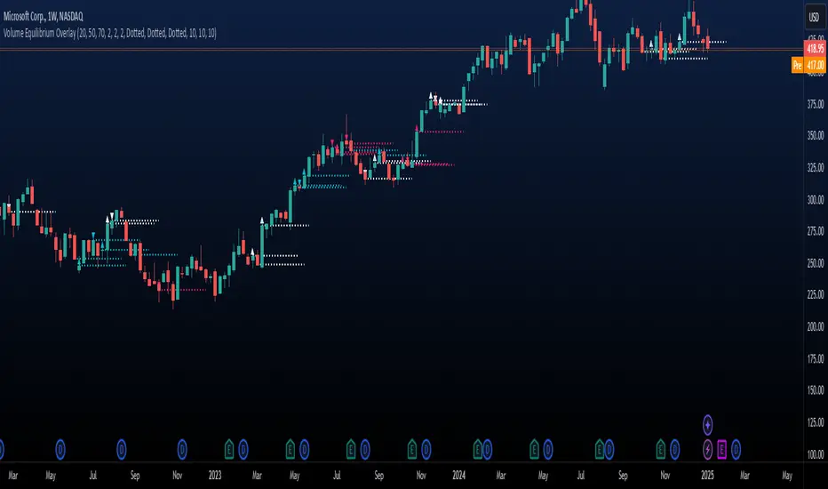 To sum it up in a brief manner, this script plots when there is "volume-equilibrium" aka prices that the market may see as "fair-value" relative to the specified timeframe. This script provides what my last code lacked and that is a visual representation of critical prices.