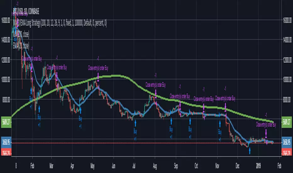 Depending on whether the market is above or below the 200 SMA, the script determines if the market is in bullish or bearish territory. Above the 200 SMA, the script will ignore the 20 EMA as a buy condition and buy solely on the confirmation of a bullish MACD cross upon the close of a candle. In this bullish market, the script will only enable the sell condition if both the MACD is bearish AND a close below the 20 EMA occurs. This is to reduce the chances of the script selling prematurely in the event of a bearish MACD cross, if the market is still in overall bullish territory.