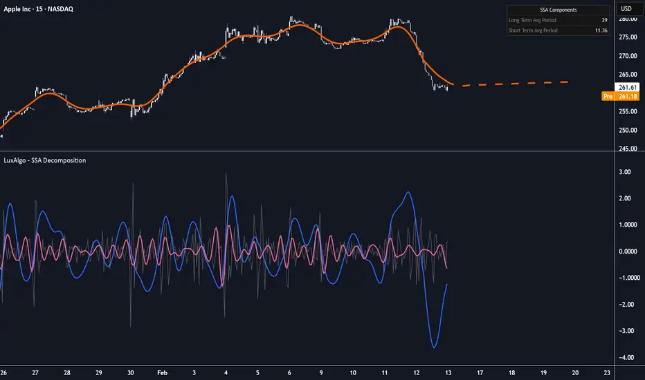 The Singular Spectrum Decomposition [LuxAlgo] indicator is a powerful analytical tool that decomposes price action into distinct, interpretable components—Trend, Periodic cycles, and Noise—using the Singular Spectrum Analysis (SSA) methodology.