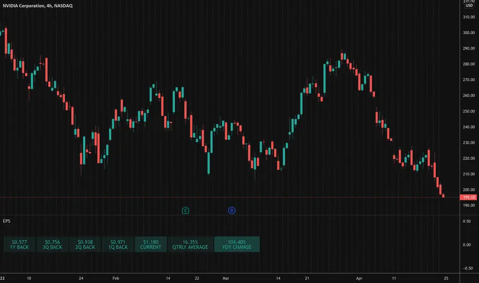 This script creates a little table in an indicator below your chart that allows you to view the earnings per share over the last year as well as calculates the year over year earnings per share growth. According to IBD, strong EPS growth is a great indicator of a potential super-performer stock so hopefully this will make it easier to keep an eye on this metric. Note it does not work on things without financial data like crypto, indexes, and ETFs.
