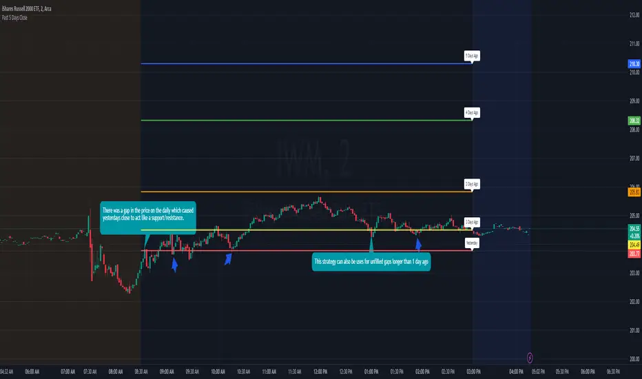 Plot the Script: Apply the "Past 5 Days Close" script to your chart. This will plot the closing prices of the past five trading days as lines on the chart. These lines will serve as reference points for potential gap close levels.