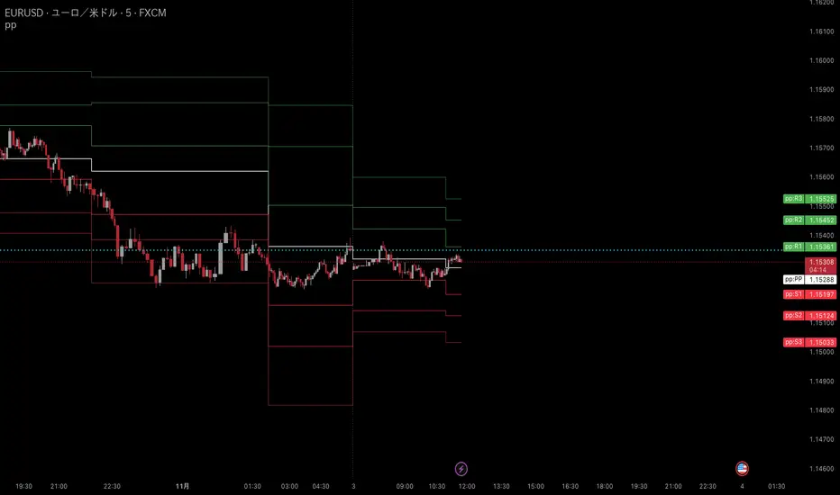 This indicator uses the classic pivot point formula, calculated from high, low, and close values: