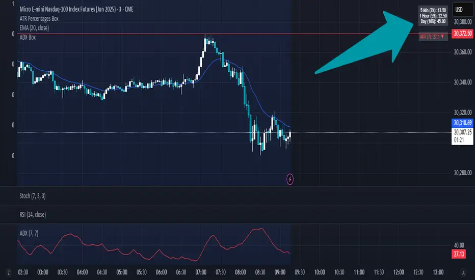 The ADX Box indicator provides traders with a quick and intuitive way to monitor the current trend strength based on the Average Directional Index (ADX), calculated with a customisable period (default: 7 periods).
