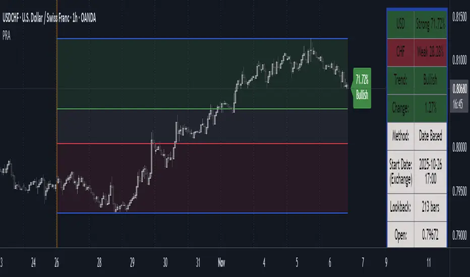 This indicator analyzes a specific periodic range, which can start from a fixed date or a defined lookback period. It draws percentage levels and colored zones between the highest and lowest price. It also displays a detailed information table, which shows the price's position within the range in "Trend" mode, and the relative strength of currency pairs in "Forex" mode. The current price position is also indicated by a label with a percentage value and the name of the corresponding zone.