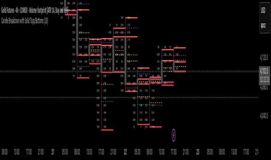 This Pine Script v5 indicator for TradingView, named "Candle Breakdown with Solid Tops/Bottoms," visually dissects each candlestick into four sections: whole candle (low to high), top wick (body top to high), body (open to close), and bottom wick (low to body bottom). For each section, it plots:Solid horizontal lines (width=2) at the top and bottom (e.g., high/low for whole candle, body top/bottom for body).
