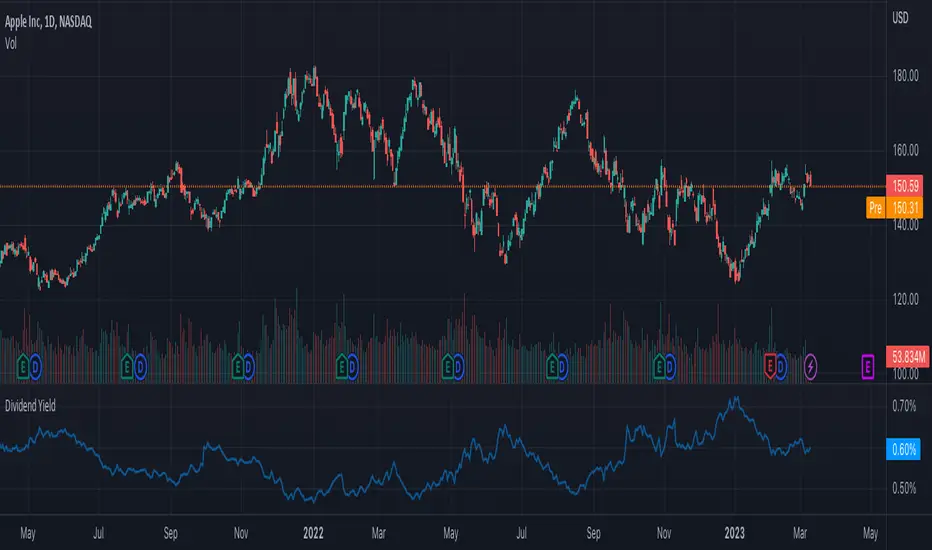 A simple indicator that shows the current dividend yield over time. The indicator uses the last quarter's dividend and extrapolates it to the full year.