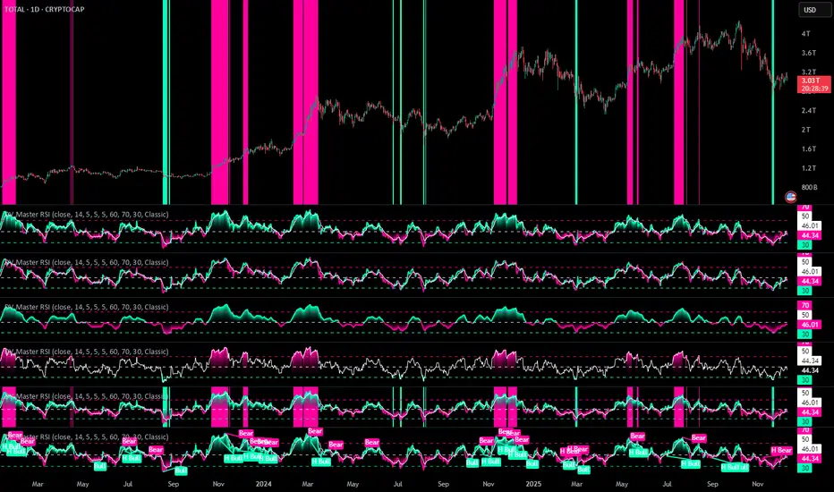 The Relative Strength Index (RSI) is one of the most foundational and widely utilized momentum oscillators in technical analysis. While traditionally used to gauge overbought and oversold conditions, its true power lies in identifying subtle shifts in market momentum and divergence from price action. The DV Master RSI Indicator is a sophisticated Pine Script tool designed to leverage the full strategic potential of the RSI by integrating multiple advanced signaling methods, comprehensive visual customization, and a robust anti-repainting feature. This indicator transforms the classic RSI into a complete, multi-signal trading system.