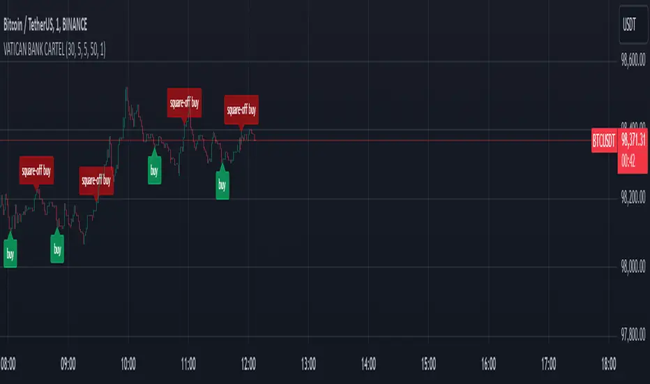 The VATICAN BANK CARTEL plots highly visible labels on the chart to mark trend reversals. These labels are customizable in terms of size and transparency, ensuring clarity in various chart environments. Traders can quickly spot buying opportunities with green labels and potential square-off points with red labels, focusing exclusively on buy-side signals.