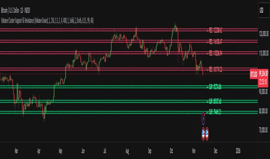 This indicator identifies potential Support and Resistance (S/R) levels on the chart using Volume-Based Point of Control (POC) Clustering. It offers extensive customization for calculation parameters, display styles, and visualization options, including S/R zones, color gradients, and historical reaction markers.
