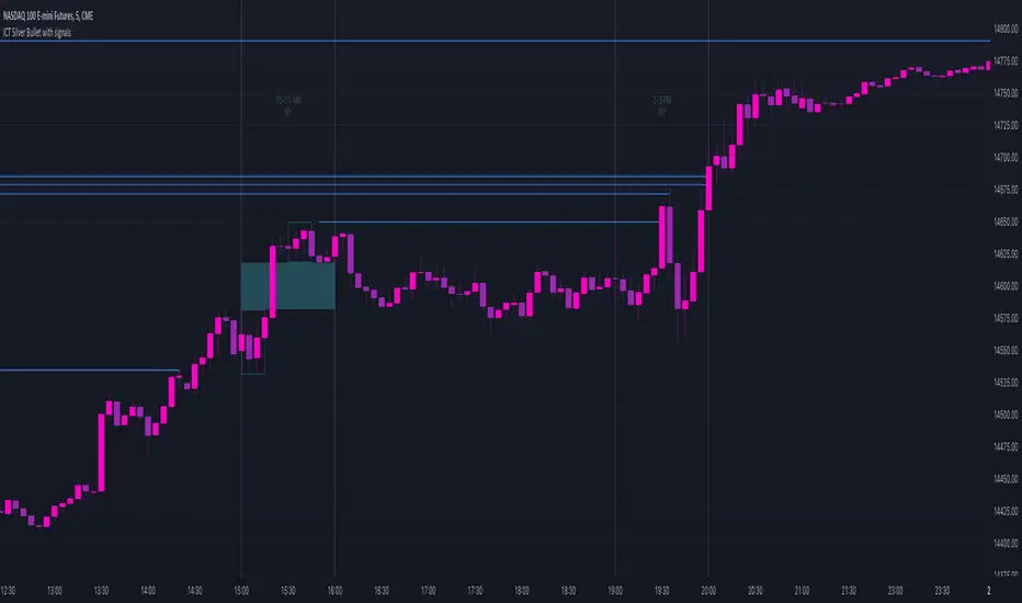 The "ICT Silver Bullet with signals" indicator (inspired from the lectures of "The Inner Circle Trader" (ICT)),