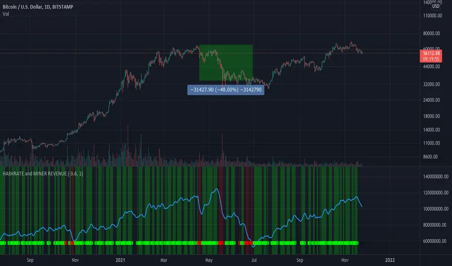 This script uses daily data points from Quandl which measure Bitcoin mining hashrate, and miner revenue, and averages the two. The two data sets are fairly zigzaggy, so to smooth the data I am use a John Ehlers' filter to reduce the noise. Why did I combine the two? Both have correlation to BTC price action, and by combining hashrate and revenue, I believe it produces a stronger and more accurate signal. At times when the background is green (also displayed with a green square at the bottom), conditions are good in Bitcoinland with miner revenue/hashrate going up. No color in the background and no dot, means the combined miner revenue and hashrate indicator is dropping, but nothing to get worried about. Seeing red dots on the bottom along with a red background signals a rapidly dropping rate of hashrate/miner revenue, and with a fairly strong correlation to the Bitcoin price. Not every red zone foretells a drop in the Bitcoin price, but a significant number of them do. I wrote this script as an early warning system for when to move out of Bitcoin. Use at your own risk. Feel free to modify this code to suit your personal needs. Please only use on BTC /USD pairs with 1D bars. Since there is only one data point per day published by Quandl, it will not give accurate data for shorter timeframes. Enjoy.