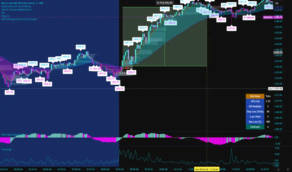 Contract size calculator with custom inputs for ATR based stops with multiplier or hard tick based calculations for stop size.