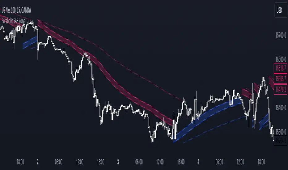 This indicator provides two different Parabolic SAR indicators, the first one has the settings that you chose and displays the zone, meanwhile, the second one has half the parameters you have chosen and can be used to determine the long-term trend direction.