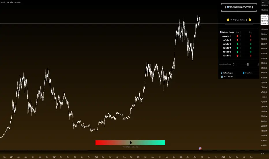 The Trend Following Composite Index (TFCI) is designed to provide traders with a comprehensive view of market trends by combining several technical indicators in a single, unified tool. Each component brings its unique perspective, and together they create a well-rounded signal that may help traders better understand the current market condition. TFCI simplifies the decision-making process by aggregating these signals into one easy-to-read confidence percentage, allowing traders to quickly gauge whether the market is trending upwards, downwards, or is in a period of indecision.