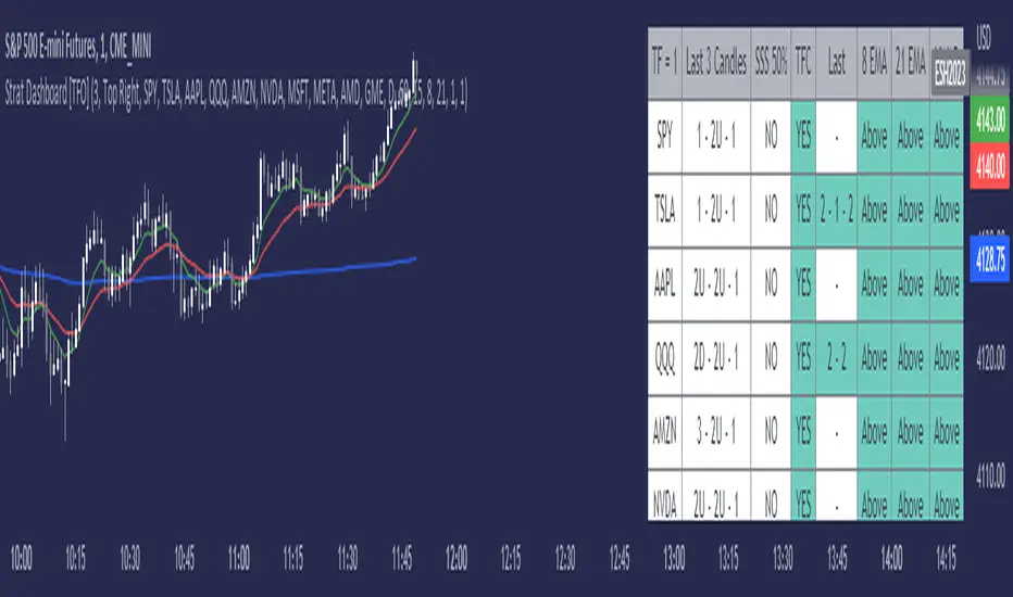 The Strat Dashboard tracks up to 10 signals while highlighting common strat reversal patterns, the SSS 50% rule, timeframe continuity, and some additional criteria with VWAP and moving averages.