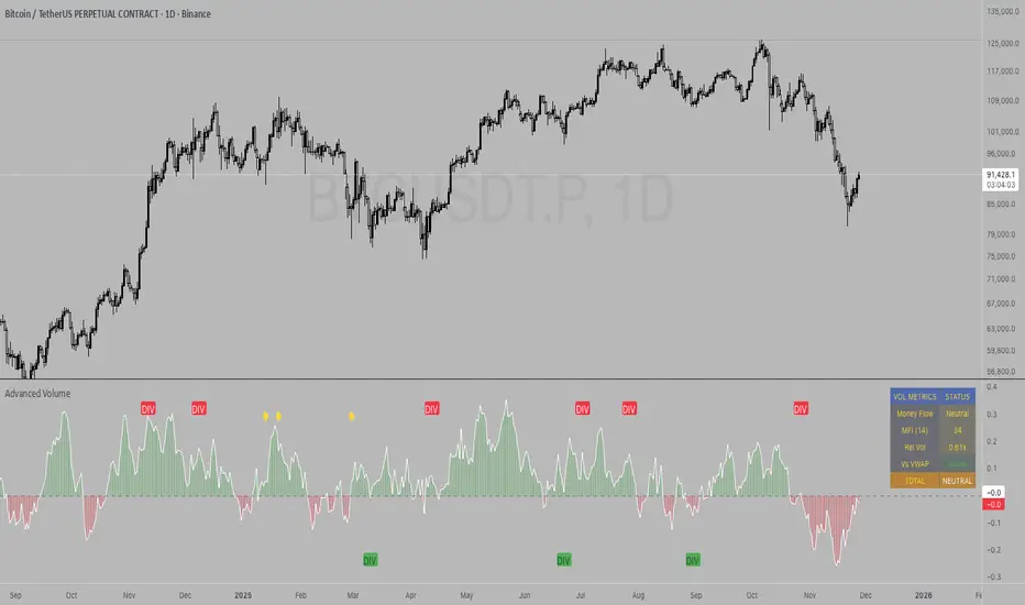 Advanced Volume is a modular volume analysis suite designed to uncover hidden buying and selling pressure that standard volume bars often miss. Instead of cluttering your chart with multiple oscillators, this tool combines five institutional metrics—Chaikin Money Flow (CMF), Money Flow Index (MFI), Volume RSI, Relative Volume (RVOL), and Volume Oscillator—into a single, adaptive pane.