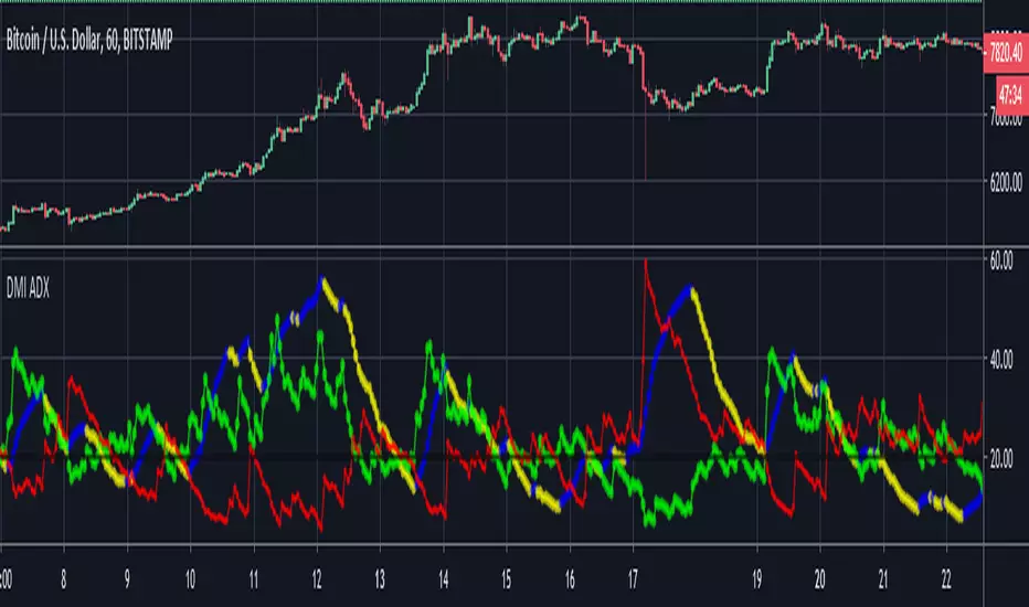 In easy language Green is for bullish , red is for bearish ,and third line which is of blue and yellow will tell you about the trend strength doesn't matter in which direction. Blue will tell you that trend is getting strength and vice versa for yellow.