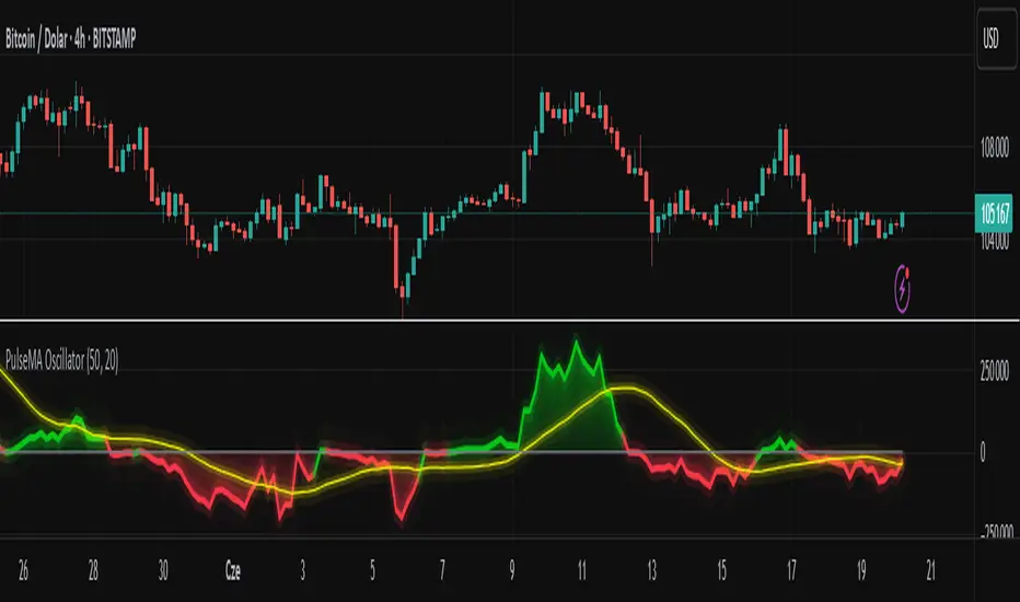 PulseMA Oscillator is a technical analysis tool that transforms the relationship between price and a base moving average (EMA) into an oscillator fluctuating around a zero line. It is based on counting consecutive candles closing above or below the EMA and factoring in the slope of the average to gauge trend momentum.