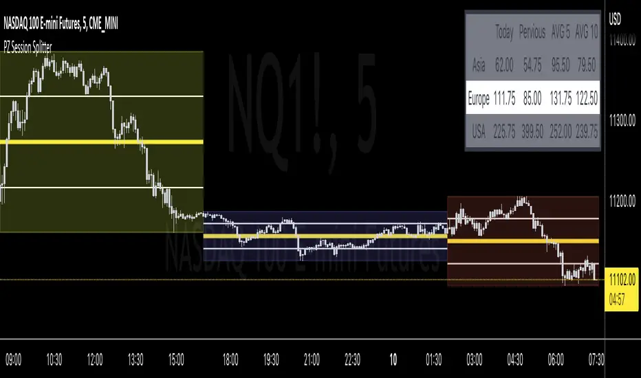 Split any 24-hour session into 3 segments to determine range statistics and midpoints. Ideal for futures traders to analyze the overnight sessions (Asia and Europe). Also great for splitting the day session into different parts (initial balance, mid-day, closing power-hour). Customize colors and names of sessions along with 50% and 25% midpoints.