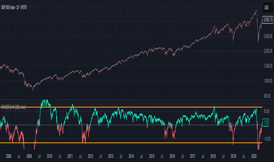 Illustrates percent deviation from 200 SMA and +/- 13% bands where historically reversals have tended to occur.