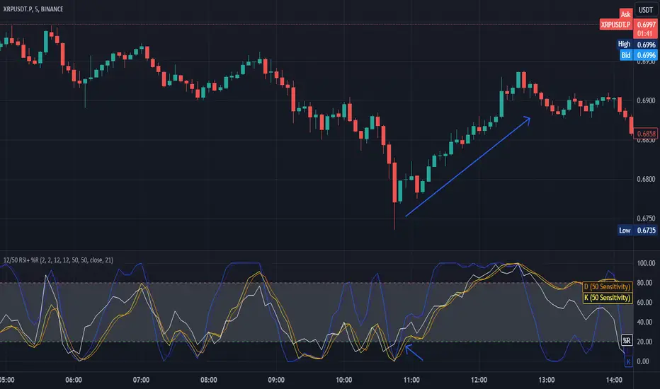 2/50 RSI+ %R is a PineScript indicator that combines two popular technical indicators, the Relative Strength Index (RSI) and the Williams %R. The indicator plots two lines, K and D, which represent the smoothed moving averages of the RSI. It also plots the RSI with a 60-period length and the Williams %R with a 21-period length. The indicator can be used to identify overbought and oversold conditions, as well as potential reversals.