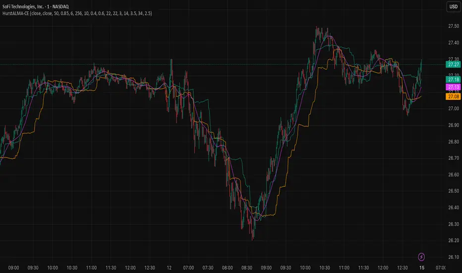Hurst × ALMA Tuned Chandelier Exit (HurstALMA-CE) is an adaptive trend‑following stop and exit indicator. It combines a smoothed price input (ALMA), a regime detector based on the Hurst exponent, and a dynamically tuned Chandelier Exit to automatically adjust its behavior between choppy and trending market conditions.